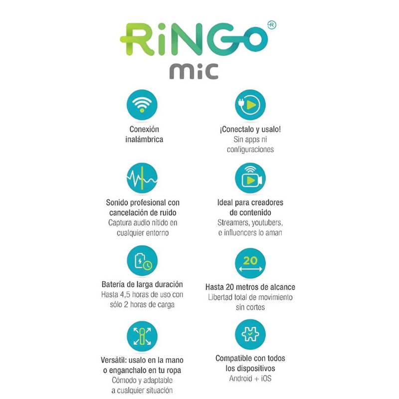 Captura audio de alta calidad en estéreo con este micrófono doble que incluye conexión USB-C y un adaptador Lightning, compatible con la mayoría de smartphones Android y dispositivos Apple (iPhone/iPad). Su diseño compacto y liviano permite una grabación profesional en cualquier lugar.